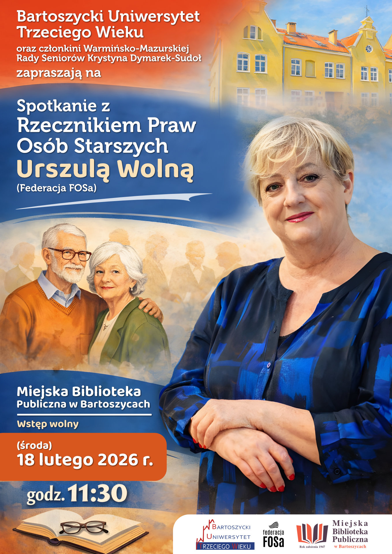 Bartoszycki Uniwersytet Trzeciego Wieku oraz członkini Warmińsko-Mazurska Rada Seniorów Krystyna Dymarek-Sudoł zapraszają na wyjątkowe spotkanie z Urszulą Wolną – Rzecznikiem Praw Osób Starszych z ramienia Federacja FOSa.